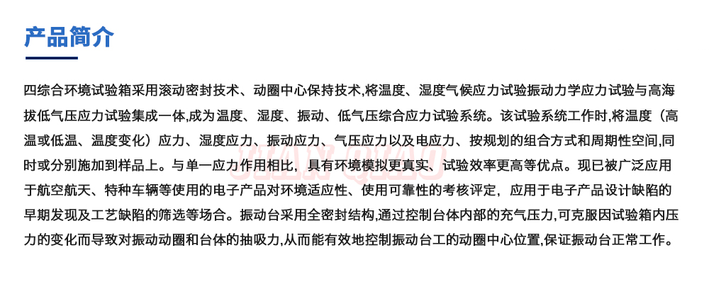 用途:四綜合環(huán)境試驗箱采用滾動密封技術(shù)、動圈中心保持技術(shù),將溫度、濕度氣候應(yīng)力試驗振動力學(xué)應(yīng)力試驗與高海拔低氣壓應(yīng)力試驗集成一體,成為溫度、濕度、振動、低氣壓綜合應(yīng)力試驗系