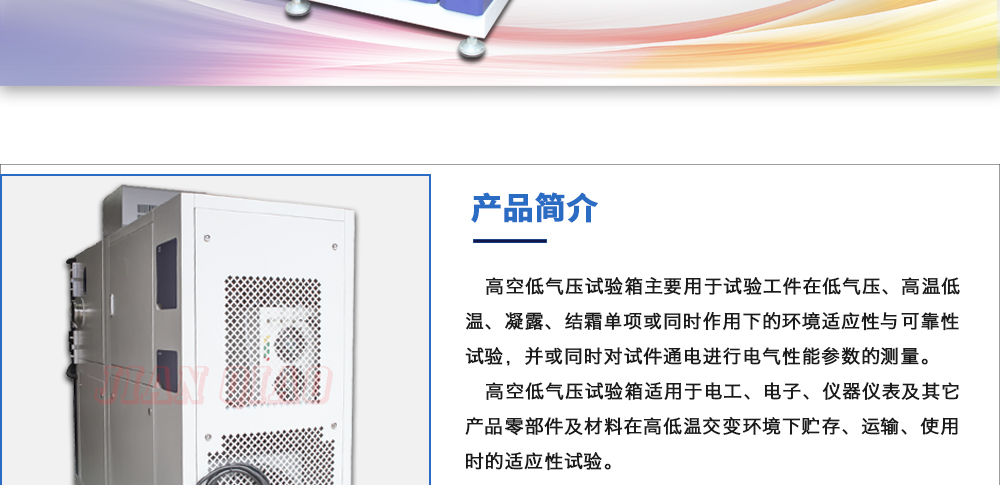用途:高空低氣壓試驗箱主要用于試驗工件在低氣壓、高溫低溫、凝露、結霜單項或同時作用下的環(huán)境適應性與可靠性試驗,并或同時對試件通電進行電氣性能參數(shù)的測量。高空低氣壓試驗箱