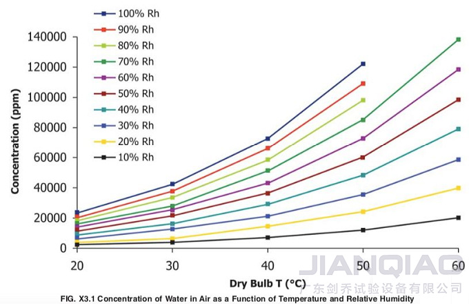 附錄X3中,表3.1是恒定水蒸氣含量下,相對濕度與溫度的關(guān)系。而圖3.1是水蒸氣含量、溫度、相對濕度三者之間的關(guān)系。在考慮了相對濕度對產(chǎn)品材料的損傷性后,大家可以針對一定溫度建立適宜的相對濕度范圍,進(jìn)而調(diào)整試驗條件。