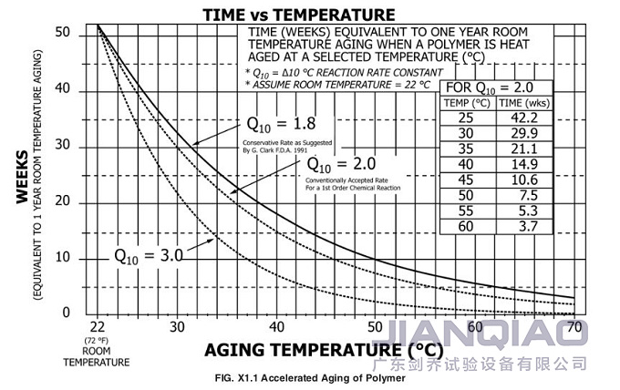 大家仔細(xì)分析上述兩個公式可以發(fā)現(xiàn),決定加速老化時間的關(guān)鍵因素是加速老化溫度,根據(jù)ASTM F1980-16附錄X1.1,能夠明確無菌屏障系統(tǒng)在選定溫度下的熱老化相當(dāng)于1年的室溫老化的時間。例如,若確定Q10為2,加速老化溫度選用50℃,則加速老化時間為7.5周。特別要注意的是,大多數(shù)醫(yī)用聚合物建議的溫度上限是60℃。